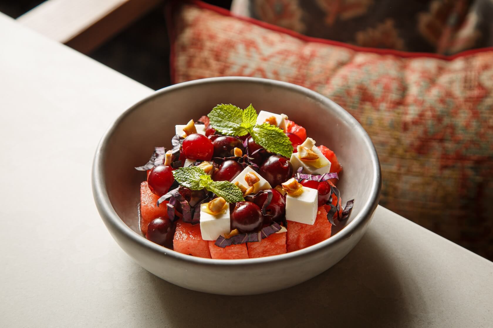 Салат с арбузом и сыром Фета (520 ₽) — Арбуз, сыр фета, вишня, миндаль в карамели, базилик, мята.